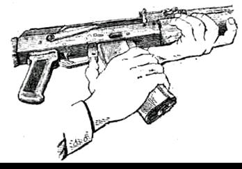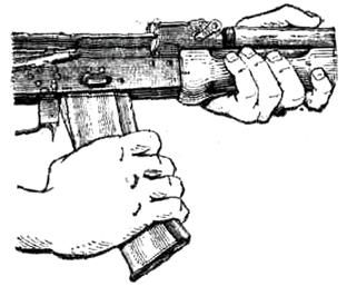Неповне розбирання автомата (кулемета) проводиться у наступному порядку: 1. Відокремити магазин. Утримуючи автомат (кулемет) лівою рукою за шийку приклада або цівку, правою рукою обхопити магазин (рис. 1.5.27); натискаючи великим пальцем на засувку, подати нижню частину магазина вперед і відокремити його.