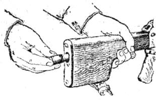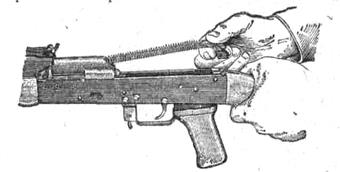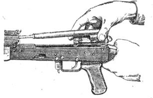Рис. 1.5.34. Поворот замикача газової трубки за допомогою пеналу належності 2. Приєднати затвор до затворної рами. Взяти затворну раму в ліву руку, а затвор у праву і вставити його циліндричною частиною в канал рами; повернути затвор так, щоб його ведучий виступ ввійшов у фігурний виріз затворної рами, і просунути затвор уперед. 3. Приєднати затворну раму з затвором до ствольної коробки. Взяти затворну раму в праву руку так, щоб затвор утримувався великим пальцем у передньому положенні. Лівою рукою обхопити шийку приклада, правою ввести газовий поршень у порожнину колодки прицілу і просунути затворну раму вперед настільки, щоб відгини ствольної коробки ввійшли в пази затворної рами, невеликим зусиллям притиснути її до ствольної коробки і просунути вперед. 4. Приєднати поворотний механізм. Правою рукою ввести поворотний механізм у канал затворної рами; стискаючи поворотну пружину, подати направляючий стрижень вперед і, опустивши трохи донизу, ввести його п’ятку в подовжній паз ствольної коробки. 5. Приєднати кришку ствольної коробки. Вставити кришку ствольної коробки переднім кінцем у напівкруглий виріз на колодці прицілу; натиснути на задній кінець кришки долонею правої руки вперед і донизу так, щоб виступ направляючого стрижня поворотного механізму ввійшов в отвір кришки ствольної коробки. 6. Спустити курок з бойового взводу і поставити на запобіжник. Натиснути на спусковий крючок і підняти перемикач нагору до відмовлення. 7. Приєднати в автомата дульний гальмо-компенсатор, у кулемета - полум’ягасник. Навернути дульний гальмо-компенсатор (полум’ягасник) на різьбовий виступ основи мушки (на ствол) до упора. Якщо паз дульного гальма-компенсатора (полум’ягасника) не збігся з фіксатором, необхідно відвернути дульний гальмо-компенсатор або полум’ягасник (не більш одного обороту) до сполучення паза з фіксатором. 8. Приєднати шомпол. 9. Вкласти пенал в гніздо приклада. Вкласти протирку, йоржик, викрутку і вибивач у пенал і закрити його кришкою, вкласти пенал дном у гніздо приклада (рис. 1.5.35) і утопити його так, щоб гніздо закрилося кришкою. В автоматів із прикладом, що складається, пенал убирається в кишеню сумки для магазинів. 10. Приєднати магазин до автомата (кулемета). Утримуючи автомат (кулемет) лівою рукою за шийку приклада або цівку, правої ввести у вікно ствольної коробки зачіп магазина (рис. 1.5.36) і повернути магазин на себе так, щоб засувка заскочила за опорний виступ магазина.