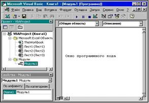 Visual Basic for Applications – развитая система визуального программирования для создания прикладных программ в среде Microsoft Office. В результате своей эволюции Visual Basic превратился в объектно-ориентированный язык программирования. Объекты – это естественные детали VBA-ландшафта. Посредством объектов вы получаете доступ к функциональным возможностям VBA-приложения. С практической точки зрения объект – это просто именованный элемент, имеющий: ¡ свойства, то есть установки, которые вы можете проверить или изменить; ¡ методы, то есть действия, которые объект может выполнить, если программа попросит об этом; ¡ события, то есть возможные для объекта ситуации, на которые он может ответить заранее предопределенными действиями. Прежде чем программировать на VBA, следует запустить табличный процессор Microsoft Excel или любое другое приложение Microsoft Office, т.к. VBA является встроенным языком программирования данного пакета. Редактор Visual Basic является командным центром для работы в VBA. Вызов редактора Visual Basic осуществляется при помощи команды Сервис → Макрос → Редактор Visual Basic ( или клавиатурным сочетанием Alt+F11) главного меню Microsoft Excel. Для написания программы необходимо создать модуль VBA и открыть окно его программного кода при помощи команды Вставка → Модуль. В результате этих действий на экране появится окно редактора Visual Basic (рис. 1).