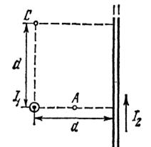1. По двум бесконечно длинным прямым проводам, скрещенным под прямым углом, текут токи I1 = 30 А и I2 = 40 А. Расстояние d между проводами равно 20 см. Определить магнитную индукцию В в точке С (см. рис), одинаково удаленной от обоих проводов на расстояние, равное d.