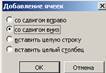 Для виділення цілих рядків або стовпців таблиці, окрім проходження мишею по всіх потрібних клітинках, можна скористатися й іншими способами, наприклад, командами Таблиця/Виділити рядок або Таблиця/Виділити стовпець, які виділяють рядки чи стовпці, що містять виділені клітинки. Команда Таблиця/Виділити таблицю виділяє всю таблицю. Якщо у таблиці виділено рядки, стовпці або клітинки, то командами Таблиця/Вставити/Рядки вище та Таблиця/Вставити/Рядки нижче можна вставити нові рядки вище або нижче від виділених, причому їх вставляється стільки, скільки було виділено перед виконанням команди. Стовпці вставляють аналогічно командами Таблиця/Вставити/Стовпці зліва та Таблиця/Вставити/Стовпці справа. Окремі клітинки вставляють у таблицю командою Таблиця/Вставити/ Клітинки після виділення потрібної їх кількості. Ця команда відкриває вікно Додавання клітинок, де треба зазначити спосіб виконання операції (рис.25): • зі зсувом праворуч - виділені клітинки зсуваються вправо; • зі зсувом донизу - виділені клітинки зсуваються вниз; • вставити цілий рядок - буде вставлено рядки перед першою виділеною клітинкою; • вставити цілий стовпець - буде вставлено стовпці перед першою виділеною клітинкою.