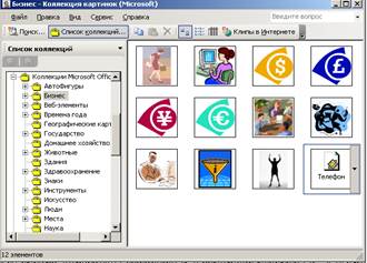 Багато цікавих ілюстрацій є у спеціальній графічній бібліотеці ClipArt Gallery.Щоб вставити звідти малюнок у документ, необхідно виконати команду Вставка/Рисунок/Картинки (рис.30).