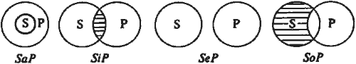 В отношении противоречия (контрадикторности) находятсясуждения SaP и SoP, SeP и SiP. Они не могут быть одновременно истинными и ложными. Если одно из них истинно, то другое ‒ ложно. Примеры. Если суждение «Все киты дышат легкими» истинно, то суждение «Некоторые киты не дышат легкими» ложно. Если суждение «Некоторые медведи – не бурые» истинно, то суждение «Все медведи – бурые» ложно. В отношении п ротивоположности (контрарности) находятся суждения SaP и SeP. Они могут вместе быть ложными, но не могут быть вместе истинными. Если одно из противоположных суждений истинно, то другое ложно. Примеры. Суждения «Все спортсмены – гроссмейстеры» и «Ни один спортсмен не гроссмейстер» оба ложны. Поскольку суждение «У всех людей есть головы» истинно, то суждение «Ни у одного человека нет головы» ложно. Если суждение «Все металлы не являются газами» истинно, то суждение «Все металлы – газы» ложно. В отношении частичного совпадения (субконтрарности) могут находиться суждения SiP и SoP. Они не могут быть одновременно ложными, но могут быть одновременно истинными. Примеры. Если суждение «Некоторые овцы – хищники» ложно, то суждение «(По меньшей мере) некоторые овцы не являются хищниками» истинно. суждения же «Некоторые спортсмены – футболисты» и «Некоторые спортсмены не футболисты» оба истинны. В отношении подчинения находятся попарно суждения SaP и SiP, SeP и SoP. Из подчиняющего суждения логически следует подчиненное: из SaP вытекает SiP и из SeP вытекает SoP. Это означает, что из истинности подчиняющего суждения логически следует истинность подчиненного, и из ложности подчиненного следует ложность подчиняющего. Примеры. Из суждения «Все киты являются млекопитающими» следует суждение «Некоторые киты млекопитающие», а из суждения «Все металлы не являются сжимаемыми» следует суждение «Некоторые металлы не сжимаемы». Категорический силлогизм Категорический силлогизм (или просто: силлогизм) – это дедуктивное умозаключение, в котором из двух категорических суждений выводится новое категорическое суждение. Логическая теория такого рода умозаключений называется силлогистикой. Она была создана Аристотелем. В силлогистике выражения «Все... есть...», «Некоторые... есть...», «Все... не есть...» и «Некоторые... не есть...» рассматриваются как логические постоянные, т.е. берутся как единое целое. Это не суждения, а определенные логические формы, из которых получаются суждения путем подстановки вместо многоточий каких-то имен. Подставляемые имена называются терминами силлогизма. Существенным является следующее традиционное ограничение: термины силлогизма не должны быть пустыми или отрицательными. Пример силлогизма. Все жидкости упруги. Вода – жидкость. Вода упруга. В каждом силлогизме должно быть три термина: меньший, бó льший и средний. Меньшим термином называется субъект заключения. В примере таковым является термин «вода». Бó льшим термином именуется предикат заключения. В примере таким термином является термин «упруга». Термин, присутствующий в посылках, но отсутствующий в заключении, называется средним. В примере таким термином является термин «жидкость». Меньший термин обозначается обычно буквой S, бó льший – буквой Р и средний – буквой М. Посылка, в которую входит бó льший термин, называется бó льшей. Посылка с меньшим термином называется меньшей. Большая посы