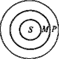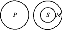 Отношения между тремя терминами этого силлогизма (модус Barbara) представляются тремя концентрическими кругами. Эта схема интерпретируется так: если все М (металлы) входят в объем Р (ковких тел), то с необходимостью S (железо) войдет в объем Р (ковких тел), что и утверждается в заключении «Железо ковко». Пример. Все рыбы (Р) не имеют перьев (М). У всех птиц (S) есть перья (М). Ни одна птица (S) не является рыбой (Р).