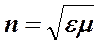 Скорость распространения ЭМВ в диэлектриках , где - абсолютный показатель преломления среды, равный , ( диэлектрическая проницаемость среды, магнитная проницаемость среды). Для диэлектриков и абсолютны показатель n преломления определяется только диэлектрическими свойствами среды .