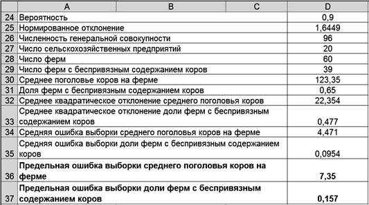 Р и с. 4.29 4.6. Щелкните левой кнопкой мыши на кнопке < ОК>. 5. Рассчитайте среднюю долю ферм с беспривязным содержанием коров. Для этого введите в ячейку D31 формулу =D29/D28. 6. Рассчитайте среднее квадратическое отклонение среднего поголовья коров на ферме, используя статистическую функцию СТАНДОТКЛОН. Для этого вставьте в ячейку D32 функцию =СТАНДОТКЛОН(D3: D22). Порядок вставки изложен в пункте 4. 7. Рассчитайте среднее квадратическое отклонение средней доли ферм с беспривязным содержанием коров. Для этого вставьте в ячейку D33 математическую функцию =КОРЕНЬ(D31*(1-D31)). 8. Рассчитайте средние ошибки выборки среднего поголовья коров на ферме и средней доли ферм с беспривязным содержанием. 8.1. Вставьте в ячейку D34 математическую функцию =КОРЕНЬ(D32^2/$D$27*($D$26-$D$27)/($D$26-1)). 8.2. Скопируйте ячейку D34 в ячейку D35. 9. Рассчитайте предельные ошибки выборки среднего поголовья коров на ферме и средней доли ферм с беспривязным содержанием. 9.1. Введите в ячейку D36 формулу =$D$25*D34. 9.2. Скопируйте ячейку D36 в ячейку D37. Результаты решения выводятся на экран дисплея в следующем виде (рис. 4.30).