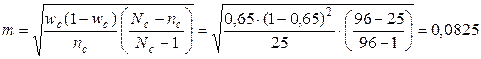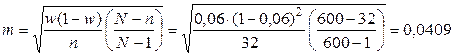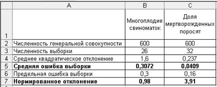 Пример 2. По данным примера 2 в разделе 1 требуется определить, какая будет вероятность осуществления заданной ошибки, если ошибку уменьшить вдвое для среднего многоплодия свиноматок и увеличить вдвое для средней доли мертворожденных поросят. В первом случае ошибка выборки будет 0, 3, а во втором - 0, 16, а численность выборки, соответственно, 26 и 32. Расчеты ведутся по формулам для случайной бесповторной выборки. Средние ошибки выборки: среднего многоплодия свиноматок: