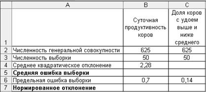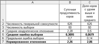 2. Рассчитайте среднее квадратическое отклонение для доли коров с удоем выше и ниже среднего. Для этого вставьте в ячейку С4 математическую функцию =КОРЕНЬ(0, 5*(1-0, 5)). 3. Рассчитайте средние ошибки выборки среднего суточного удоя молока и доли коров с удоем выше среднего. 3.1.Вставьте в ячейку В5 математическую функцию =КОРЕНЬ(B4^2/B3*(B2-B3)/(B2-1)). 3.2. Скопируйте ячейку В5 в ячейку С5. 4. Рассчитайте нормированные отклонения для среднего суточного удоя молока и доли коров с удоем выше среднего. 4.1.Введите в ячейку В7 формулу =B6/B5. 4.2. Скопируйте ячейку В7 в ячейку С7. Результаты решения выводятся на экран дисплея в следующем виде (рис. 4.36).