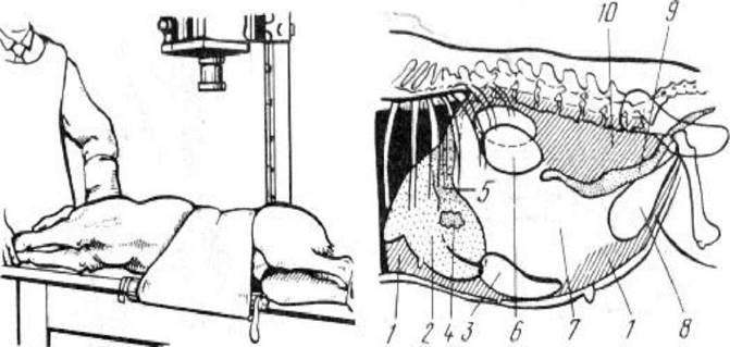 | Рис 12. Укладка животного при рентгенографии брюшной полости в прямой проекции и рентгенанатомия органов 1 - сердце, 2 - печень, 3 - газ в двенадцатиперстной кишке, 4 - правая почка, 5 -сосок молочной железы, 6 - мочевой пузырь, 7-газ в ободочной кишке, 8 - левая почка, 9- селезенка, 10 - газ в желудке