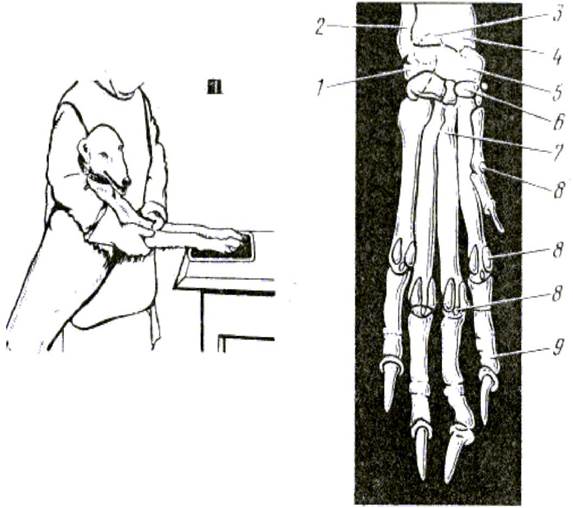 | Рис. 17. Укладка животного при рентгенографии карпального сустава (слева) и пястья в прямой проекции: 1 - локтезапястная кость; 2 - локтевая кость; 3 - добавочная кость запястья; 4 - лучевая кость: 5 - лучезапястняя кость; 6 - I-IV кости второго ряда запястья (справа налево); 7 - III пястная кость; 8 -сезамовидные кости; 9 - фаланга пальца (дистальная)