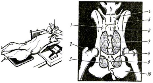 | Рис. 18. Укладка животного при рентгенографии таза и бедер в прямой проекции; рентгенанатомические детали: 1 - крестцово-подвздошное сочленение, 2 - большой вертел бедра; 3 -запирательное отверстие; 4 - поясничный позвонок; 5 - крыло подвздошной кости. 6 - крестцовая кость; 7 -хвостовой позвонок; 8 - вертлужная впадина. 9 - лонная кость; 10 - седалищная кость