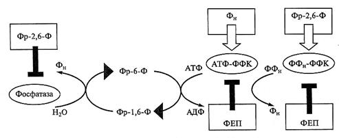 Рис. 4.6. Регуляция гликолиза у растений на уровне реакции фосфорилирования фруктозо-6-фосфата: Фр-6-Ф — фруктозо-6-фосфат; Фр-1, 6-Ф — фруктозо-1, 6-бисфосфат; Фр-2, 6-Ф — фруктозо-2, 6-бисфосфат; АТФ-ФФК — АТФ-зависимая фосфофруктокиназа; ФФН-ФФК — пирофосфат-зависимая фосфофруктокиназа; фосфатаза — фруктозо-1, 6-бисфосфатаза; ┴ — ингибирование В регуляцию этих реакций включен еще один фактор — фруктозо-2, 6-бисфосфат, регуляторная молекула у всех эукариот. Фруктозо-2, 6-бисфосфат действует как активатор прямой и ингибитор обратной реакции, т. е. стимулирует гликолиз и подавляет глюконеогенез. У животных фруктозо-2, б-бисфосфат активирует АТФ-зависимую фосфофруктокиназу и подавляет активность фосфа-тазы. У растений в отличие от животных фруктозо-2, 6-бисфосфат не действует на АТФ-зависимый фермент, но четко активирует ФФн-зависимую фосфофруктокиназу и ингибирует фосфатазу. Пластидная изоформа АТФ-зависимой фосфофруктокиназы, как и цитозольная, активируется фосфатом и подавляется ФЕП, а также АТФ. О способах регуляции пластидной фосфатазы известно мало. Фруктозо-2, 6-бисфосфат образуется и деградирует при участии двух ферментов: фруктозо-6-фосфат 2-киназы и фруктозо-2, 6-бисфосфатазы:
