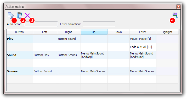 Здесь можно копировать действия, анимацию и выделение между кнопками с помощью кнопок на панели инструментов или соответствующих горячие клавиш.