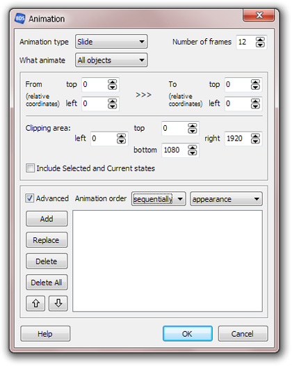 What animate и Number of frames аналогичны описанным выше. From/To значения (left/top) – относительные координаты начала и конца движения. Координаты (0, 0) означают текущую позицию. Отрицательные числа означают позицию слева и сверху по отношению к текущей позиции. Положительные – справа и снизу. Например, From значение = (0, –300), To значение = (0, 0) означает выдвижение сверху, начиная с точки, на 300 пикселей выше текущего положения. Координаты могут быть как положительными (ниже или правее текущей позиции), так и отрицательными (выше или левее текущей позиции). Clipping area – область ограничения, внутри которой будет работать анимация. По умолчанию (0, 0), (1080, 1920) означает, что ограничения нет. Include Selected and Current states – позволяет использовать выбранные и текущие состояния для анимации. Если флажок не установлен, то выбранное и текущее состояние не будут отображаться во время анимации. Это работает, только если группа анимации содержит кнопки.