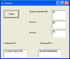Private Sub Command1_Click() AB = InputBox(" Введите длину стороны АВ", " Сторона") a = InputBox(" Введите угол А, выраженный в радианах", " Значение угла А") b = InputBox(" Введите угол И, выраженный в радианах", " Значение угла B")