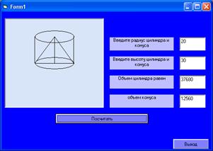 Private Sub Command1_Click() Picture1.Scale (0, 0)-(100, 100) Picture1.Cls r = Val(Text1) h = Val(Text2) V = 3.14 * r ^ 2 * h Text3 = V k = (1 / 3) * 3.14 * r ^ 2 * h