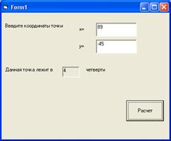 Private Sub Command1_Click() x = Val(Text1) y = Val(Text2) a = Val(Text3) b = Val(Text4) r = Val(Text5) If (x - a) ^ 2 + (y - b) ^ 2 < r ^ 2 Then Picture1.Print " принадлежит" Else Picture1.Print " не принадлежит" End Sub Задача 84. Составьте программу, которая определяет, принадлежит ли точка N (х, у, z) шару с центром в точке Z (а, b, с) и радиусом г.