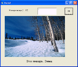 Private Sub Command1_Click() a = Val(Text1) ‘Здесь должен быть указан полный путь к папке с картинками p = " D: \Мои документы\УМК….\" Select Case a Case 1 Label2 = " Это январь. Зима" Image1.Stretch = True Image1.Picture = LoadPicture(p & " birch_snow.jpg") Case 2 Label2 = " Это февраль. Зима" Image1.Stretch = True Image1.Picture = LoadPicture(p & " birch_snow.jpg") Case 3 Label2 = " Это март Весна" Image1.Stretch = True Image1.Picture = LoadPicture(p & " icicles1.jpg") Case 4 Label2 = " Это апрель. Весна" Image1.Stretch = True Image1.Picture = LoadPicture(p & " icicles1.jpg") Case 5 Label2 = " Это май. Весна" Image1.Stretch = True Image1.Picture = LoadPicture(p & " cherry_trees.jpg") Case 6 Label2 = " Это июнь. Лето" Image1.Stretch = True Image1.Picture = LoadPicture(p & " meadow_01.jpg") Case 7 Label2 = " Это июль. Середина лета" Image1.Stretch = True Image1.Picture = LoadPicture(p & " meadow_01.jpg") Case 8 Label2 = " Это август. Позднее лето" Image1.Stretch = True Image1.Picture = LoadPicture(p & " autumnpath.jpg") Case 9 Label2 = " Это сентябрь. Осень" Image1.Stretch = True Image1.Picture = LoadPicture(p & " autumnpath.jpg") Case 10 Label2 = " Это октябрь. Осень" Image1.Stretch = True Image1.Picture = LoadPicture(p & " autumnpath.jpg") Case 11 Label2 = " Это ноябрь. Поздняя осень" Image1.Stretch = True Image1.Picture = LoadPicture(p & " leaves021.jpg") Case 12 Label2 = " Это декабрь. Скоро Новый год!! " Image1.Stretch = True Image1.Picture = LoadPicture(p & " birch_snow.jpg")