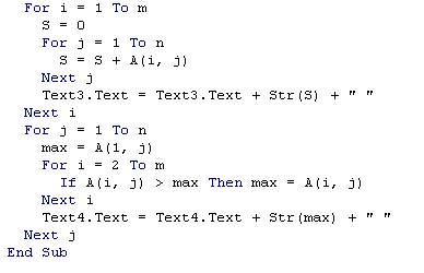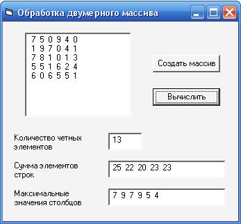 Упражнения Упражнение 1 Создадим приложение, которое двумерный массива из 5 строк и 6 столбцов заполняет случайными целыми числами из диапазона [0; 9] и определяет: 1. количество четных элементов всего массива; 2. сумму элементов каждой строки; 3. максимальные значения для каждого столбца; Реализация проекта 1. Создайте новый проект. 2. Разработайте интерфейс, аналогичный изображенному на рис. 1. 3. Программный код приложения: