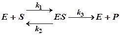 При условии, что k3> > k1, с учетом уравнения материального баланса [E]=[E0]-[ES] (индекс «0» означает начальную концентрацию) получаем уравнение Михаэлиса-Ментен. В уравнении скорость образования продукта выражена через начальную концентрацию фермента и текущую концентрацию субстрата: