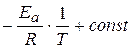 Активация вызывается повышением температуры, действием электрического поля, действием квантов света и т.д. Энергия активации Еа постоянна в данном температурном интервале и определяется механизмом реакции. Её можно определить графически по уравнению Аррениуса в линейной форме. ln k = где k0 – предэкспоненциальный множитель. В координатах ln k – 1/ T данное уравнение представляет собой прямую линию с угловым коэффициентом, равным Определенный интеграл в интервале температур Т 1 ¸ Т 2 даёт следующее выражение: