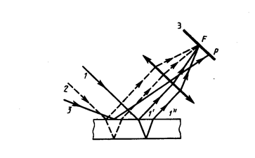Лучи 1' и 1", отразившиеся от верхней и нижней граней пластинки (рис. 8), параллельны друг другу, так как пластинка плоскопараллельна. Следовательно, интерферирующие лучи 1' и 1" «пересекаются» только в бесконечности, поэтому говорят, что полосы равного наклона локализованы в бесконечности. Для их наблюдения используют собирающую линзу и экран (Э), расположенный в фокальной плоскости линзы. Параллельные лучи 1' и 1" соберутся в фокусе F линзы (на рис. 8 ее оптическая ось параллельна лучам 1' и 1"), в эту же точку придут и другие лучи (на рис. 8 – луч 2), параллельные лучу 1, в результате чего увеличивается общая интенсивность. Лучи 3, наклоненные под другим углом, соберутся в другой точке Р фокальной плоскости линзы. Легко показать, что если оптическая ось линзы перпендикулярна поверхности пластинки, то полосы равного наклона будут иметь вид концентрических колец с центром в фокусе линзы.