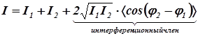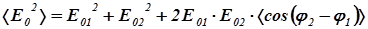 При анализе результата наложения двух волн нас интересует среднее значение квадрата амплитуды результирующего колебания Как известно, с квадратом амплитуды связана интенсивность излучения, а именно Если предположить, что амплитуды E01 и E02 колебаний за время t слабо меняются или остаются постоянными, то из выражения (1) ясно, что