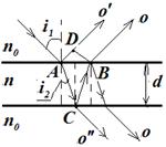 Заметим, что интерференцию в тонких пленках можно наблюдать и в проходящем свете. При этом геометрически обусловленная разность хода будет также определяться выражением (16), но не будет возникать дополнительной разности хода . Подумайте, почему? Чем отличаются картины интерференции при наблюдении их в отраженном и проходящем свете?