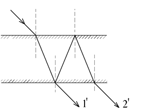 Интерференцию можно наблюдать и в проходящем свете (рис.4), если собрать на экране с помощью линзы лучи 1' и 2', прошедшие через пластину. При отражении обоих лучей от оптически менее плотной, чем сама пластина, среды не происходит скачкообразного изменения фазы на p. Поэтому условия для интерференционных максимумов и минимумов для проходящего света поменяются местами по сравнению с соответствующими условиями для отраженного света.