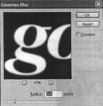 После того как слиток будет готов, выберите инструмент Туре (Текст) и серым цветом напишите подходящее слово (рис. 4). Выберите массивный шрифт (полужирный), хотя очень громоздкие буквы тоже не подойдут. 1.5. Переведите текст в растр. Щелкните правой кнопкой мыши на слое с текстом, и из раскрывшегося меню, выберите команду Rasterize Layer (Растрировать слой). Выделите текст. Наиболее простой способ — дважды щелкнуть левой кнопкой мыши на этом слое на палитре Layers (Слои). Сохраните выделение в отдельном канале в виде маски. Для этого щелкните на белом кружке, ограниченном штриховой линией, расположенном в нижней части палитры Channels (Каналы), либо выполните команду Select • Save Selection (Выделение • Сохранить выделение). 1.6. Сделайте активным только что созданный канал (просто щелкните на нем на палитре каналов) и размойте его с помощью фильтра Gaussian Blur (Размытие по Гауссу) из раздела Blur (Размытие), с радиусом, равным 2-3 пикселам (рис. 5).
