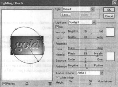 1.7.Вернитесь в RGB-канал и откройте палитру Layers (Слои). Убедившись в том, что активен слой с текстом, выполните команду Filter • Render • Lighting Effects (Фильтр • Освещение • Эффекты света). В разделе Texture Channel (Текстура канала) выберите канал с размытым текстом. Остальные настройки на нашем изображении были такими (рис. 6):