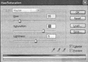 Рис. 9. Текст после цветокоррекции. 1.9. Раскрасьте надпись, превратив ее в блестящее золото. Для этого надо воспользоваться командой Image •Adjustments • Hue/Saturation (Изображение • Настройки • Тон/Насыщенность) либо сочетанием клавиш Ctrl+U.Установите флажок Colorize (Тонирование) и, передвигая ползунки, подберите подходящие параметры. Рис. 8. Вид кривой