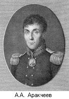 Аракчеев Алексей Андреевич (1769-1834 гг.) - российский государственный и военный деятель, генерал от артиллерии (1807 г.). Родился в семье небогатого помещика. В 1787 г. окончил Шляхетский артиллерийский и инженерный корпус, был оставлен при нем преподавателем математики. В 1791-1792 гг. старший адъютант директора корпуса и преподаватель в семье Н.И. Салтыкова, по рекомендации которого в 1792 г. назначается командиром пехотного батальона, командир артиллерии, с 1796 г. - инспектор артиллерии, затем и пехоты всего Гатчинского войска наследника престола Павла Петровича (Павла I). Ревностным отношением к делу А.А. Аракчеев обратил на себя внимание Павла I. В 1796 г. - комендант Петербурга. В 1797-1799 г. - командир лейб-гвардии Преображенского полка и генерал-квартирмейстер всей армии, с 1799 г. - инспектор всей артиллерии. Дважды - 1798 и 1799 гг. - увольнялся со службы. В 1803 г. Александр I восстановил его в должности инспектора артиллерии. В 1807 г. назначен был состоять при императоре с правом издавать указы от его имени по артиллерийской части. За 5 лет пребывания на этом посту А.А. Аракчеев провел важные мероприятия по реорганизации и оснащению артиллерии. В 1808 г. он назначается военным министром и генерал-инспектором всей артиллерии (до 1819 г.). За это время А.А. Аракчееву удалось создать жесткую систему централизации в руководстве органами высшего военного управления. А.А. Аракчеев подчинил себе военно-походную канцелярию императора, ввел должность дежурного генерала, образовал Инженерную экспедицию, все крепости России были разделены на 10 округов, подчиненные окружным командирам. Во время русско-шведской войны 1808-1809 гг. А.А. Аракчеев лично руководил снабжением действующей армии всем необходимым. В 1810 г. он был освобожден от должности военного министра и назначен председателем департамента военных дел при Государственном совете, сопровождал Александра I в его поездках в ходе Отечественной войны 1812 г. Участия в боевых действиях не принимал, поэтому отказался от звания генерал-фельдмаршала (1814 г.). С 1815 г. фактически руководил Государственным советом, Комитетом министров, Собственной его императорского величества канцелярией, стал единственным докладчиком императору по большинству министерств и ведомств исполнял приказания только императора Александра I. В 1815 г. начал создавать военные поселения, с 1819 г. - начальник над всеми военными поселениями. В 1818 г. по поручению императора участвовал в разработке проекта по освобождению крестьян. На его гербе начертано " Без лести предан". Его преданность двум императорам - Павлу I и его сыну Александру I - стала легендарной. Когда был задушен Павел I, рыдал как ребенок; рубашку, однажды подаренную ему Александром I, хранил всю жизнь. В 1826 г. уволен в отпуск по болезни и выехал в Карлсбад. После возвращения в Россию жил в своем имении Грузино, занимался устройством хозяйства в Грузино: открыл там госпиталь и Крестьянский заемный банк. После его смерти его имение и капитал в размере 1, 5 млн. руб. были переданы Новгородскому (Нижегородскому) кадетскому корпусу, получившего название Аракчеевского. В дореволюционной и советской историографии под влиянием отрицательного отношения современников к личности А.А. Аракчеева сложилась негативная оценка его личности и деятельности. В настоящее время в связи с углубленным изучением истории во