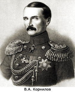 Корнилов Владимир Алексеевич (1806-1854 гг.) - военно-морской деятель, вице-адмирал (1852 г.), герой Севастопольской обороны 1854-1855 гг. во время Крымской войны 1853-1856 гг. В 1823 г. окончил Морской кадетский корпус, с 1823 г. служил на Балтийском флоте. С 1827 г. нес службу на линкоре " Азов", участвовал в Наваринском морском сражении 1827 г. и русско-турецкой войне 1828-1829 гг. С 1834 г. начал службу на Балтийском флоте. Командовал бригом " Фемистокл", корветом " Орест", фрегатом " Флора". С 1839 г. командир линкора " Двенадцать апостолов". В 1846 г. был командирован в Англию, где наблюдал за строительством английских паровых судов, изучал состояние английского флота. С 1849 г. - начальник штаба Черноморского флота. В.А. Корнилов был активным сторонником замены парусных кораблей паровыми, оснащения флота новой артиллерией. В сентябре 1854 г. был назначен начальником северной стороны обороны Севастополя, затем стал начальником обороны всего города. 5 октября 1854 г. смертельно ранен ядром на Малаховом кургане. Был похоронен в адмиральской усыпальнице Владимирского собора в Севастополе, в 1992 г. перезахоронен в Адмиралтейском соборе Севастополя.