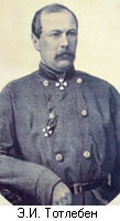 Тотлебен Эдуард Иванович (1818-1884 гг.) - русский военный инженер, с 1869 г. - инженер - генерал. В 1836 г. окончил Главное инженерное училище. Участвовал в боевых действиях на Кавказе в 1848-1849 гг., с 1851 г. служил инженером в гвардии. В Крымскую войну руководил инженерными работами во время Севастопольской обороны (1854-1855 гг.). С 1859 г. - директор инженерного департамента в Военном министерстве. В 1863-1877 гг. товарищ (заместитель) генерал-инспектора военных инженеров, фактически руководил инженерными войсками русской армии. Разработал систему инженерных укреплений государственных границ России. С начала русско-турецкой войны 1877-1878 гг. помощник начальника Западного отряда, а с ноября 1877 г. - начальник отряда под Плевной, руководил ее осадой, закончившейся капитуляцией турецкого гарнизона. С апреля 1878 по январь 1879 г. руководил действующей армией. С 1879 г. член Государственного совета, генерал-губернатор Одессы и командующий войсками Одесского военного округа. В 1880 г. был назначен виленским, ковенским и гродненским генерал-губернатором и командующим войсками Виленского военного округа. Известен также как военный историк. Умер в г. Зоден в Германии, но похоронен в Севастополе, где в 1909 г. ему был поставлен памятник.