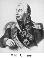 Кутузов (Голенищев-Кутузов) Михаил Илларионович (1745-1813 гг.) - государственный деятель, великий русский полководец, генерал-фельдмаршал (1812 г.). После окончания артиллерийско-инженерной школы был оставлен при ней для обучения воспитанников. В 1761 г. был произведен в офицерское звание прапорщика и направлен для прохождения службы в Астраханский пехотный полк, в 1765 г. командир роты. В русско-турецкой войне 1768-1774 гг. находился на строевых и штабных должностях, принимал участие в сражениях при рябой Могиле, Ларге, Кагуле, проявил себя храбрым, инициативным офицером. С 1776 г. служил под командованием А.В. Суворова. В русско-турецкой войне 1787-1791 гг. особенно отличился при штурме турецкой крепости Измаил в 1790 г., 6-я колонна под его командованием решила исход сражения. По окончании этого сражения произведен в генерал-поручики и назначен комендантом Измаила. В 1793 г. отправлен чрезвычайным и полномочным послом в Турцию, где разрешил ряд в пользу России ряд важных вопросов и улучшил отношения с ней. С 1794 г. назначен главным директором Сухопутного кадетского корпуса, с 1795 г. одновременно являлся командующим войсками в Финляндии. В русско-австро-французской войне 1805 г. М.И. Кутузов командовал армией. В октябре 1805 г., нанеся поражение маршалам И. Мюрату под Амштеттеном и Э. Мортье под Дюренштейном, затем вывел свои войска с места сражения под нависшей угрозой окружения. Император Александр I возложил на него ответственность за поражение в Аустерлицком сражении 1805 г. и отстранил от командования. В 1806 г. М.И. Кутузов был назначен военным губернатором Киева, командиром корпуса в Молдавскую армию. В 1809 - литовским военным губернатором. В 1811 г. Во время ведения русско-турецкой войны 1806-1812 гг. Александр I назначил М.И. Кутузова главнокомандующим Молдавской армией. Несмотря на ряд побед над турецкими войсками, в дальнейшем Александр I отстранил его от командования. В начале Отечественной войны 1812 г. М.И. Кутузов был избран начальником петербургского, а затем московского ополчения. В августе 1812 г. Александр I под давлением общества вынужден был назначить М.И. Кутузова главнокомандующим всей русской армией. 26 августа у подмосковной деревни Бородино М.И. Кутузов дал сражение французской армии. По преданию, когда М.И. Кутузов у деревни Бородино выбирал место для предстоящего сражения, вдруг прямо над ним, высоко в небе, стал парить орел. Это посчитали добрым знаком. Бородинское сражение не принесло победу ни одной стороне, но боевой настрой русских войск был уже другим: отступать " с русским Кутузовым" было легче, чем с " немцем Барклаем". На военном совете в Филях 1 сентября 1812 г. М.И. Кутузов принял решение оставить Москву. Это решение далось ему нелегко, по свидетельству адъютанта, после М.И. Кутузов проплакал всю ночь. Затем 5-21 сентября М.И. Кутузов скрытно провел Тарутинский маневр, вывел войска из-под удара, сосредоточил ее в районе села Тарутино, закрыл для Наполеона пути продвижения в южные районы страны и стал накапливать силы для контрудара. После этого русская армия стала вести войну на истощение противника. У Тарутино (6 октября), под Малоярославцем (12 октября) М.И. Кутузов дал сражение французам и вынудил их отступать по разоренной ими ранее Смоленской дороге. Параллельно преследуя противника, М.И. Кутузов разбил французов в Вяземском сражении (22 октября), под Крас