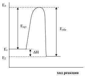 Кривые имеют четко выраженный максимум и сильнее растянуты в сторону больших скоростей. Скорость “W” называется наиболее вероятной, она не совпадает со средними скоростями. По Алексееву активные молекулы - это молекулы, располагающиеся в хвосте Максвелловской кривой, т.е. обладающие избыточной скоростью. Кривая распределения скоростей данного газа зависит только от температуры. При повышении температуры скорость молекул возрастает. Максвелловская кривая сдвигается вправо, одновременно уменьшается максимум, но доля молекул, обладающих избыточной скоростью резко возрастает (площадь, ограниченная кривой и осью “W”). Максвелловская кривая количественно описывается уравнением Больцмана. Для частного случая, когда энергия молекул зависит только от двух степеней свободы (движение в плоскости) уравнение имеет вид: NE/N0 = e -E/RT, где NE - число молекул с энергией не меньше “Е”, N0 - обще число молекул. Такая же зависимость для числа двойных столкновений: ZE/Z0 = e -E/RT. Правый член (e -E/RT) - фактор Больцмана (фактор активации): ZE = Z0·e -E/RT, где ZE - число активных соударений, Z0 - общее число соударений. С повышением температуры число активных соударений резко увеличивается. Основное положение теории активных соударений: реагируют лишь те молекулы, энергия которых в момент столкновения не ниже некоторого предела “Е”, называемого энергией активации. Таким образом, энергией активации называется та минимальная избыточная энергия по сравнению со средней величиной, которой должны обладать молекулы, чтобы их столкновение привело бы к реакции. Рассмотрим ход реакции в зависимости от энергетического состояния молекул (рис. 5.4.): А + В↔ С + Д, Е1 - энергия исходных веществ, Е2 - энергия продуктов реакции, Е3 - наименьший запас энергии, которым должны обладать молекулы, чтобы их столкновения могли привести к химическому взаимодействию.