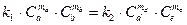 где W 1 и W 2 - скорости прямой и обратной реакции, k 1 и k 2 - константы пропорциональности (константы скоростей прямой и обратной реакций), Сa, Сb, Сd, Се, - концентрации реагирующих веществ, ma, mb, md и me - соответствующие стехиометрические коэффициенты. Из уравнений (2.15) и (2.16) видно, что если концентрации реагирующих веществ изменяются во времени (например, в случае, когда количество исходных продуктов задано и не возобновляется), то скорости прямой и обратной реакции также являются функциями времени. Вначале скорость прямой реакции наибольшая, а скорость обратной реакции равна нулю, потому конечных продуктов еще нет. В дальнейшем скорость прямой реакции будет уменьшаться, а обратной - возрастать, так как концентрация конечных продуктов будет увеличиваться. Наступит момент, когда скорость обратной реакции станет равной скорости прямой реакции, т.е. наступит химическое равновесие. Полнота сгорания топлива, т.е. полнота прямой реакции, определяется соотношением концентраций исходных веществ и конечных продуктов, создавшихся к моменту достижения химического равновесия. Найдем соотношение концентраций в момент равновесия. Приравняем правые части уравнений (2.15) и (2.16)