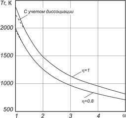 Рис. 2.4. Зависимость температуры горения керосина в воздухе от коэффициента избытка воздуха a На рис. 2.4 показано влияние коэффициента избытка воздуха a на температуру горения керосина при Т н= Т ст=293К для двух значений химической полноты сгорания: η =1, 0 и η =0, 8. Из этой диаграммы также следует, что простейшие расчетные формулы можно применять при Т г< 2100К, так как влияние диссоциации мало. Для углеводородно-воздушных смесей это соответствует a> 1, 2.