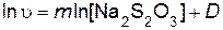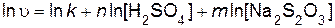 Так как эта реакция протекает по сложному механизму, то порядки реакции по веществу отличаются от стехиометрических коэффициентов. Порядок реакции по серной кислоте n и порядок реакции по тиосульфату натрия m определяют, используя логарифмический вид дифференциального кинетического уравнения (пример 5)