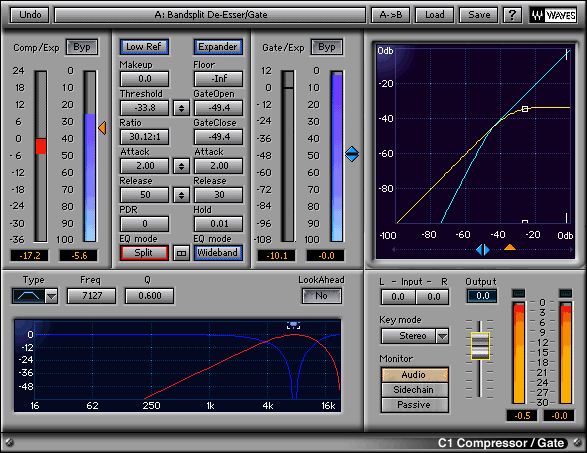 Плагин C1 comp-gate - универсальный процессор динамической обработки: компрессор, деэсер, экспандер, гейт, а также сочетание двух приборов, включенных последовательно, и многое другое. Это наиболее полнофункциональный плагин серии C1, имеющийся в пакете Waves Platinum Native Bundle 4. Все более простые плагины этой серии входят в него как отдельные модули. Плагин потребляет много ресурсов компьютера, значительно больше, чем каждый из его компонентов в отдельности. Поэтому использовать C1 comp-gate нужно только в том случае, когда требуется выполнить комплексную и сложную динамическую обработку сигнала. Смотреть на окно плагина страшно: столько здесь всякого нагромождено! Но это только поначалу. Приглядевшись, вы увидите, что практически все элементы вам знакомы.