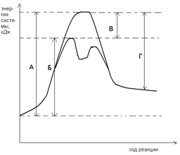 если общее давление в системе уменьшить в 3 раз? а) уменьшится в 6 раз б) уменьшится в 18 раз в) увеличится в 18 раз г) уменьшится в 27 раз д) увеличится в 27 раз 3. При температуре 600 С скорость реакции равна 0, 64 моль/л.с. Какова скорость реакции (моль/л.с.) при 200С? Температурный коэффициент скорости реакции равен 3. а) 0, 127 моль/л.с. б) 0, 008 моль/л.с. в) 0, 053 моль/л.с. г) 7, 68 моль/л.с. 4. На рисунке показана энергетическая диаграмма двух различных механизмов для одной и той же реакции. Укажите энергию активации прямой реакции, идущей без катализатора а) А б) Б в) Г г) В
