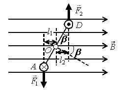 б Рис. 7 На участки AD и BC магнитное поле действуют с силами, которые меняются от нуля до максимального значения (в зависимости от угла поворота рамки β) и стремятся растянуть рамку (на рис. 8 а эти силы не указаны). На участки AB и CD магнитное поле действуют с постоянными силами , где S = a · b – площадь рамки. Момент сил будет максимальным при β = 90° (рамка расположена вдоль линий индукции)