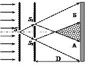 В опытах Юнга свет от монохроматического источника света параллельным пучком падал на экран с узкой щелью S, являющейся источником расходящегося светового потока. В качестве параллельного источника Юнг использовал солнечный свет, прошедший через светофильтр. Свет от источника S попадал на две параллельные узкие щели S 1 и S 2, расположенные на расстоянии d друг от друга. В результате на экране, в области перекрывания световых потоков от вторичных источников S 1 и S 2 между точками А и Б, возникала интерференционная картина в виде чередующихся темных и светлых полос. Если расстояние между экраном и вторичными источниками равно D, то ширина интерференционной полосы оказывается равной