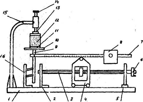 Прибор для определения прочности (рис.3) смонтирован на станине 1 и имеет откидную траверсу 15, подшипники 2 и 5, стоику 16. На стойке шарнирно закреплена подвижная опора 9 с лотком 10 и нижней опорной площадкой 11 для установки образца. Подвижная опора шарнирно связана с рычагом 7, на котором жестко закреплен груз 8. Откидная траверса 75 снабжена винтом 14, перемещающим верхнюю опорную площадку 13 для фиксации испытуемого образца 12.