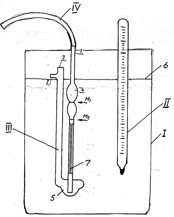 Измерение вязкости основано на определении времени истечения через капиляр определённого объёма жидкости из измерительного резервуара. При проведении испытаний при температурах выше температуры окружающей среды используются термостат или баня вискозиметра. В качестве бани используют любой прозрачный сосуд такой глубины, чтобы нефтепродукт, находящейся в вискозиметре, был погружен не менее чем на 20 мм ниже уровня жидкости в бане и не менее чем на 20 мм над дном бани. При температуре в бане от 0 до 1500С погрешность поддержания температуры составляет ï 0, 10С. При определении кинематической вязкости вискозиметр заполняют испытуемым продуктом. Для этого на отводную трубку 3 надевают резиновую трубку. Далее, зажав пальцем колено 2 и перевернув вискозиметр, опускают колено 1 в сосуд с нефтепродуктом, который имеет требуемую температуру, и засасывают его (с помощью резиновой груши, водоструйного насоса или иным способом) до метки М2, следя за тем, чтобы в жидкости не образовались пузырьки воздуха. Вынимают вискозиметр из сосуда и быстро возвращают в нормальное положение. Снимают с внешней стороны конца колена 1 избыток жидкости и надевают на его конец резиновую трубку IV (рис. 2.) с грушей. Вискозиметр III устанавливают в термостат (баню) I, так чтобы расширение 4 было ниже уровня 6 жидкости. Требуемую температуру в термостате устанавливают, смешивая холодную и горячую воду, и замеряют термометром II. После выдержки вискозиметра