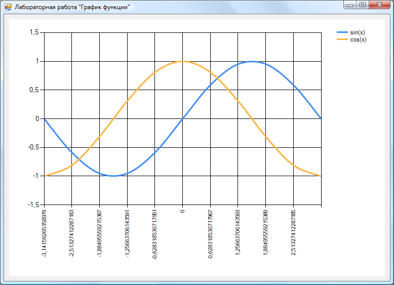 Построение графика (диаграммы) производится после вычисления таблицы значений функции y=f(x) на интервале [Xmin, Xmax] с заданным шагом. Полученная таблица передается в специальный массив Points объекта Series компонента Сhart с помощью метода DataBindXY. Компонент Chart осуществляет всю работу по отображению графиков: строит и размечает оси, рисует координатную сетку, подписывает название осей и самого графика, отображает переданную таблицу в виде всевозможных графиков или диаграмм. При необходимости компоненту Сhart передаются данные о толщине, стиле и цвете линий, параметрах шрифта подписей, шагах разметки координатной сетки и другие настройки. В процессе работы программы изменение параметров возможно через обращение к соответствующим свойствам компонента Chart. Так, например, свойство AxisX содержит значение максимального предела нижней оси графика и при его изменении во время работы программы автоматически изменяется изображение графика.
