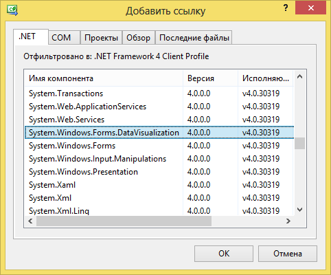 Поскольку данный класс не входит в пространства имен, подключаемые по умолчанию, следует выполнить дополнительные действия. Во-первых, в Обозревателе решений нужно щёлкнуть правой кнопкой по секции Ссылки и добавить ссылку на библиотеку визуализации (рис. 8.2):