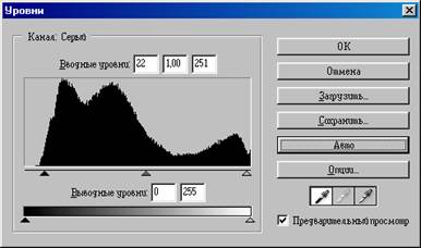 3. Расширьте динамический диапазон изображения. Для этого щелкните на кнопке Авто. Граничные движки уровней сместятся к центру – левый на уровень 22, правый на уровень 251. Снимок станет более контрастным.