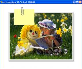 Шаг 3. Выберите команду Штиховка (Stroke) из раскрывающегося меню Добавить стиль слоя Шаг 4. Выберите из списка стиль Падающие тени (Drop Shadow), чтобы отобразить соответствующие параметры. Уменьшите значение параметра Мутноватость (Opacity) до 50%, сбросьте флажок Использовать глобальное освещение (Use Global Light), а значения параметров Расстояние (Distance) и Размер (Size) увеличьте до 10. Щелкните на кнопке OK, чтобы добавить к фотографии рамку с тенью, как показано на рисунке. Создайте еще один слой, щелкнув на значке Шаг 5. Нажмите клавишу < M>, чтобы выбрать инструмент Прямоугольная область (Rectangular Marquee), с помощью которого создайте прямоугольную область (подобную той, что показана на рисунке). Щелкните на образце основного цвета и выберите подходящий оттенок желтого (например, R=255, G=255, B=161). Залейте выделенную область выбранным цветом, нажав комбинацию клавиш < Alt+Backspace>. Снимите выделение, нажав комбинацию клавиш < Ctrl+D>.